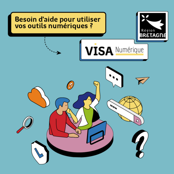 Proposé et financé par la Région Bretagne, le Visa Numérique Bretagne vise à accompagner gratuitement les Bretonnes et les Bretons pour les aider à devenir autonomes dans leurs usages numériques. En fonction des besoins de chacun, les médiateurs riches du réseau proposeront un parcours ajusté avec les modules choisis et à un rythme adapté.